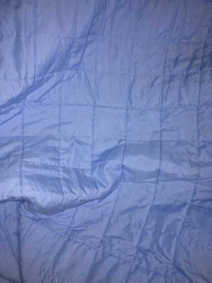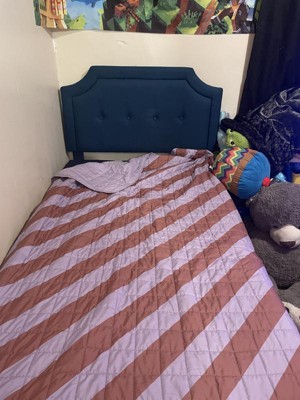 This quilt looks great on my son's bed. The design is simple and so cute. I love that the dark green and light blue stripes aren’t too busy looking. On the other side of the striped side, it’s solid light blue. The quilt is made of 100% polyester and it’s so soft. It also keeps him warm at night without the quilt being too bulky or heavy on him.