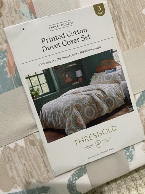 Elevate the look of your bed with this 3-Piece Boho Suzani Print Duvet Cover and Sham Set from Threshold™. This coordinated bedding set includes a full/queen duvet cover and two matching pillow shams, all featuring a suzani medallion pattern in muted green, brown and peach colors on a cream backdrop for boho-inspired appeal. The 100% cotton fabric offers comfortable year-round use, and the duvet cover is designed with zip closures 3 sides to make it easier to change your bedding. Corner ties will hold your comforter in place.