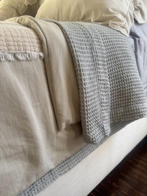[This review was collected as part of a promotion.] This waffle weave blanket is the perfect addition if you are wanting a cozy and textured bed. It is light enough you won't have to worry about getting overheated especially if you love the layered aesthetic. We have a king size bed and it did not shrink in the washer and fits the entire length of the bed. It has held up with multiple washes and is a great neutral color. It is a waffle wave so it isn't the softest material but compared to other waffle blankets it is on the softer side. Very reasonably priced.