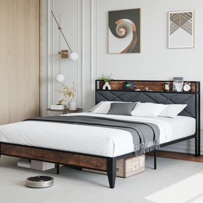 Full Size Bed Frame with Storage Headboard, Metal Platform Bed, Tufted Design, No Box Spring Needed, Easy Assembly, Grey