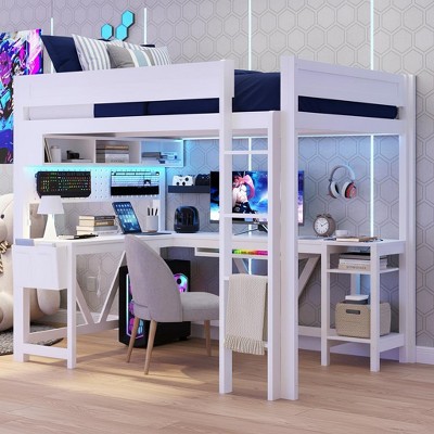 Full Size Loft Bed with Desk and Shelves, Wooden Loft Bedframe with Two Built-in Drawers for Bedroom