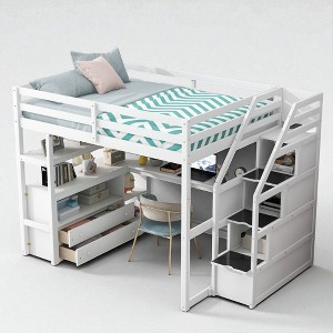 Elevate your bedroom with this full size loft bed that seamlessly blends functionality, storage, and style. Designed to maximize space and organization, this all-in-one loft bed features a built-in desk, open shelves, two spacious drawers, and a storage staircase for easy and safe access to the top bunk. Crafted from solid pine wood and MDF with sturdy slats for support, this bed is both durable and stylish. Whether you're studying, working, or relaxing, this bed is a practical solution for modern living spaces. Product Features