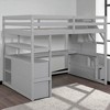 Elevate your bedroom with this full size loft bed that seamlessly blends functionality, storage, and style. Designed to maximize space and organization, this all-in-one loft bed features a built-in desk, open shelves, two spacious drawers, and a storage staircase for easy and safe access to the top bunk. Crafted from solid pine wood and MDF with sturdy slats for support, this bed is both durable and stylish. Whether you're studying, working, or relaxing, this bed is a practical solution for modern living spaces. Product Features