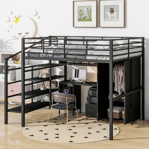 Full Size Metal Loft Bed with Table Set and Wardrobe