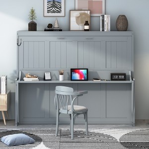 - The Full/Queen Wall Murphy Bed is a space-saving solution that combines a bed and desk. With hydraulic hinges, the desk folds away when the bed is pulled down. Available in washed white and washed gray, it fits various décor styles. The sturdy frame supports up to 600 lbs for durability and comfort. A built-in storage space lets you store both the bed and mattress together, keeping your room tidy. Recommended for use with a 10-inch mattress (not included), this Murphy bed is perfect for small spaces.