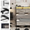 This bed frame features 20-color LED lights with dynamic/static modes, adjustable speed/brightness, controlled via remote or switch to set bedroom ambiance. It includes a charging station with 2 USB ports and 2 sockets in the middle for easy device charging or powering reading lamps. The headboard offers storage for small items like glasses/phones, while 10.7-inch under-bed space holds clothes/sundries. A sturdy metal frame with fixed slats ensures durability, no sliding/noise, and easy self-installation with labeled parts and step-by-step instructions.