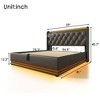 Upgrade your bedroom with our Modern Platform Bed, a perfect blend of style, innovation, and functionality. This bed features a 360-degree LED light strip with a timer and multiple dynamic lighting modes, allowing you to create an impressive sleep atmosphere or a dazzling light show synchronized with music. Control the lights effortlessly via a button or app for a personalized experience. The classic button-tufted headboard offers gentle neck support, while the skin-friendly fabric ensures a cozy and comfortable sleep environment. Conveniently located USB and Type-C charging ports on the Wingback sides keep your devices powered up, and the built-in shelf provides easy access to everyday essentials. The hydraulic storage system offers ample space under the bed for storing bulky or rarely used items, with a pull strap for easy lifting and closing. Crafted from premium iron, the bed frame features reinforced legs to prevent structural distortion and EVA anti-slip strips to reduce noise. The high-quality elastic slats provide excellent back support and a restful sleep experience. With a recessed design and two stopper bars, the mattress stays securely in place. Available in black PU and gray linen, this bed comes in four sizes: Full, Twin, Queen, and King, making it a versatile and stylish addition to any bedroom.