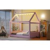 - Full Size Upholstered House Daybed with LED Light Strips, Pink: Transform any bedroom into a cozy retreat with this enchanting house-shaped bed. The whimsical design features a roof-like frame complete, sparking imagination and creating a playful atmosphere. Luxurious foam-filled corduroy fabric adorns the headboard, footboard and backrest, showcasing elegant vertical channel tufting for a touch of sophistication. Crafted from durable solid pinewood and engineered MDF, this bed combines sturdiness with dreamy aesthetics, ensuring years of sweet dreams and magical playtime. The LED light with a touch switch offers 2 colors to choose: white light and warm light, provide personalized lighting atmosphere for your night.