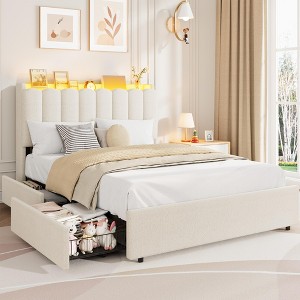 Twin to Full Size Bed Frame with LED Headboard & Storage DrawersTransform your bedroom into a stylish and functional retreat with this versatile bed frame featuring a spacious upholstered headboard equipped with customizable RGB LED lighting. The Soft boucle fabric provides a soft, skin-friendly surface perfect for reading or relaxing, while the sturdy metal frame with 10 slats supports up to 1000 lbs, ensuring long-lasting durability and noise-free comfort.Key Features: