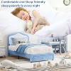 This charming bed features a padded blue headboard with elegant accents, creating a cozy and inviting sleep space. The fabric-covered design adds warmth and style to any room, perfect for enhancing bedroom decor.