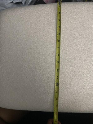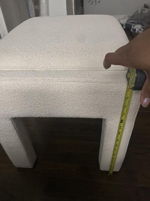 A: Hi, Thank you for your interest in our Fully Upholstered Ottoman Cream Boucle - Threshold™: Wooden Frame, Polyester, Spot Clean. The Dimensions (Overall) is 18.25 Inches (H) x 23.38 Inches (W) x 17 Inches (D). The Seat Dimensions: 18.25 Inches [floor to seat top] and the Seat Cushion Dimensions: 3.75 Inches (Thick). Hope this helps. - Lima