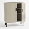 Provide additional storage in your home with the Fulton 2-Door Channel Front Buffet from Buylateral. Ideal as a buffet, this cabinet features a modern rounded edge front channel design. Equipped with four adjustable interior shelves that provide ample space for linens, dishware, serving pieces, as well as flexibility for various sized items. Finished in a soft taupe, accented with black metal legs and handles.