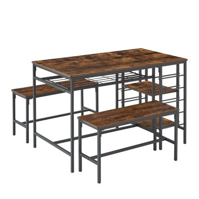 Fulvari Dining Table Set for 4, 47"L Kitchen Table with 2 Benches, Kitchen Breakfast Table Set with Wine Rack & Storage Shelf for Kitchen