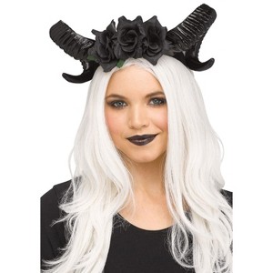 This Black Horn Flower Headpiece features black curled ram horns and black fabric roses for a dark gothic look. Dress up as a woodland forest animal, a mythical faun, or just complete your mysterious look with this floral headpiece.