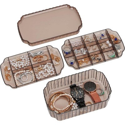 - 6 LAYERS with 5 Versatile Pull Out Drawers 2 Hidden Side Cabinets,The top layer is a removable ring layer With big mirror,The two deeper bottoms of the 5 removable drawers has only one compartment; Drawer 1 has 16 equal size slots; Drawer 2 has 9 equal size slots; Drawer 3 has 3 equal rectangle size slots. The 2 Swing out Cabinets including 8 hooks and 2 pockets, help to keep your necklaces from getting tangled