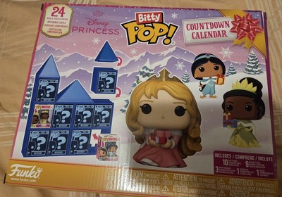 Count down to your favorite festive holiday—or any special occasion—with the Disney Princess 24 Day Bitty POP! Countdown Calendar! Open the tiny doors to reveal 10 Bitty POP! collectibles, 9 stackable display pieces, 3 holiday accessories, 1 keychain case, and 1 pin case. Expand your princess lineup by making this Disney Princess 24 Day Bitty POP! Countdown Calendar the next addition to your collection. Bitty POP! collectibles are packaged in hard acrylic cases with detachable bottom lids. Detachable bottom lids double as acrylic bases, to which the Bitty POP! figures are adhered. Vinyl figures are approximately 0.9 in (2.3 cm) tall. Acrylic keychain cases and acrylic pin cases are approximately 1.3 in W x 1.6 in H x 1.2 in D (3.3 cm W x 4.1 cm H x 3 cm D) and fit all standard Bitty POP! cases. Bitty POP! Keychain is approximately 3 in (7.6 cm) long.