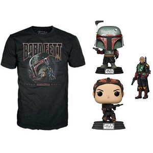 In the Funko Pop & Tee: Star Wars- Boba Fett- M - Bundle you get a Medium Sized Boba Fett Star Wars™ T-Shirt and three characters from Book of Boba Fett. You get Boba Fett comfy t-shirt and figure , FiGPiNS , and Fennec Shand. ENJOY!
