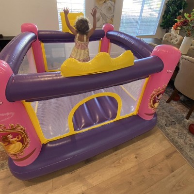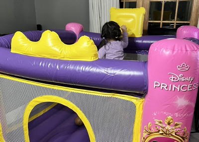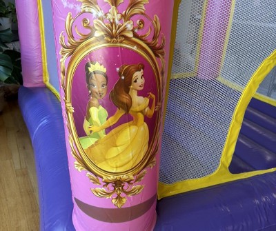 My daughter loves this bouncy. The colors are bright, her favorite princesses are displayed, and the size is perfect for our small living room. Set up was a breeze, the quality is top notch, clean up was easy too. It’s small and light enough that after playtime, I’m able to roll it up and place it in her closet for next time. I love that after it’s inflated, I can just have her play quietly because the blower is silent and not constantly on and plugged into the electricity. The basketball hoop is fun for her too. This was a definite hit in my house. Highly recommended for any girl who loves pink, purple, and all things princesses.