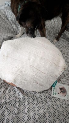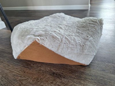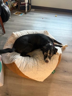 [This review was collected as part of a promotion.] Nice size pouf for my husky! It’s soft, plush and comfortable. It doesn’t flatten out too much when in use. There is a zipper to take the cover off and wash it which is a plus. It’s durable and holds up to a kid and a large dog being on it. Would definitely recommend!