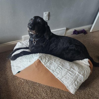 [This review was collected as part of a promotion.] Dog approved! I wasn't too sure how they'd like this big poufy one, we are use to more memory foam or flat comfy beds but they both have been whinning to get a turn to lay down on it. It was a bit harder for our senior boxer to get on, as it is pretty poufy, but it does compact a bit after use. I have not taken it apart to clean yet, but it seems simple with a zipper removable cover. Overall, it's esthetically pleasing , doesn't take up too much space and most importantly, the dogs love it! (100 lb labradoodle for picture reference on size)