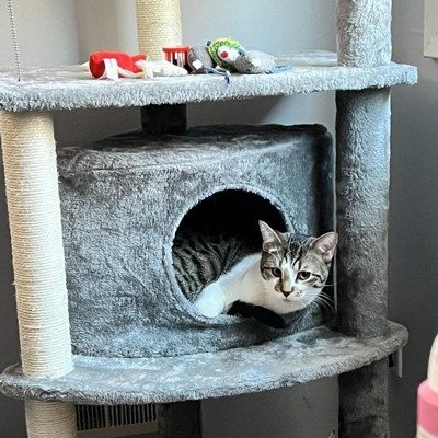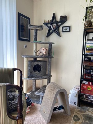 A: Hello and thank you for your question. The following measurements below show all heights from the floor to the top of each platform: Height to top perch seat: 56.6" Height to top platform: 45" Height to large top angled platform: 33.375" Height to house platform: 17" Height to bottom platform: 7.25" We hope this helps!