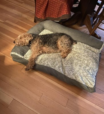 [This review was collected as part of a promotion.] I love it too! I purchased the bed in preparation for my pup’s upcoming surgery. It’s more comfortable than my mattress, seriously! I also love that it only has the pillow bolsters on two sides so he can rest against the bolsters or put his head over them, yet he can also hang his feet or head of the side like he also likes too at times. Best dog bed ever!!!!