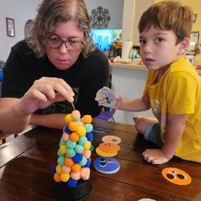 This was a fun and easy game to assemble and learn. All of my kids (2-7 years old) thought it was fun, and the adults were challenged by it. It was nice that the Pom poms were quiet when they fell down—the loud crash in other games makes playing intimidating for myself and some of my kids. Just be sure to play on a clean surface—the Pom poms collect whatever fuzz and hair you have on the floor!