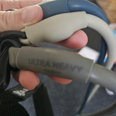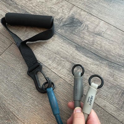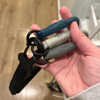 [This review was collected as part of a promotion.] The Gaiam Studio Select 3 in 1 Resistance Tube is really nice. I like having the choice of three different resistances and being able to switch them out depending on the exercise. It's a little hard to get them to click into the handles via the carabiner thing. The three bands are medium, heavy, and ultra heavy and it says what they are on the ends of the bands. I definitely recommend.