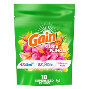 - Includes one package of Gain Super Flings Laundry Detergent Pacs 18 Count in Hibiscus Hula scent