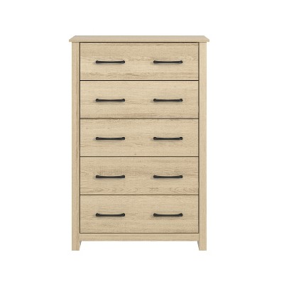 The Galano 5-drawer dresser offers practical vertical storage designed for bedrooms, guest rooms, and apartment living. Its tall profile features five smooth-glide drawers that make it easy to organize clothing, accessories, and everyday items while keeping a compact footprint on the floor. An interlock drawer system supports safer use by limiting multiple open drawers, and anti-tip hardware is included for added stability when installed properly. Crafted from manufactured wood, this dresser showcases clean lines, metal drawer hardware, and tapered legs that lift the frame slightly off the floor for a lighter look and easier cleaning underneath. The top surface provides space for everyday items or personal décor. With overall dimensions of 31.1" W × 16.9" D × 46.7" H, this dresser delivers balanced storage that fits comfortably into smaller and medium-sized rooms.