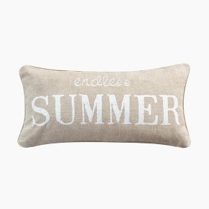 The Endless Summer decorative pillow matches perfectly with the Levtex Home Galapagos bedding collection. This pillow is sized at 12 x 24in. and features ENDLESS SUMMER printed in white on a slubbed natural hessian ground. The color palette makes this a versatile accessory for your bed, couch or favorite chair. The pilow comes pre-filled with a soft. luxurious feather inner.