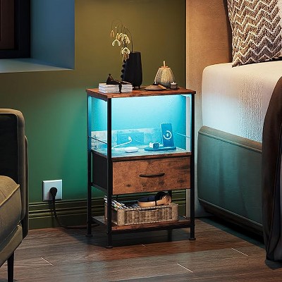 GALAXHERO LED Nightstand with Charging Station Adjustable Fabric Drawer, 3-Tier Storage Bedside Table Compact End Table for Bedroom