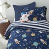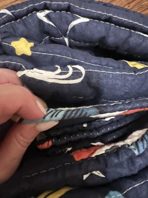 The Galaxy Reversible Kids Quilt Set by Levtex Home is inspired by the wonder of space. Offered in navy, red, yellow and white, this design will immediately transform your kid's bedroom. This reversible quilt features spaceships zooming through space, planets and stars on the front, reversing to a white and navy wide stripe on the back. The Quilt and Sham have a cotton front and back, filled with a cotton-rich filler, and are machine washable. Your child will enjoy this for years to come!