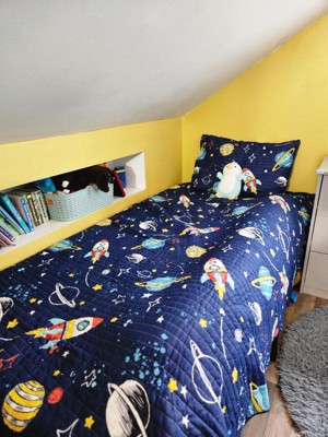 - GALAXY QUILT SET: An space ships and planets quilt and one standard sham, this quilt set is part of the Levtex Home Galaxy collection. Used by itself, as a layering piece or as a bedspread, this quilt is extremely versatile. It is the perfect set with which to decorate your kid's room.