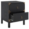 Embrace a classy, elegant, and versatile addition to your bedside with our Galio nightstand. Thoughtfully streamlined, the crisp and clean lines of our nightstand boast timeless aesthetics. It is gracefully perched and adorns a rich black veneer to enliven your bedroom. Being inspired by the effortless beauty of vintage style, our nightstand is finished off with ring pulls and gold hardware on the edges. An elegant and timeless addition, the nightstand features two drawers to store and organize all your essentials.