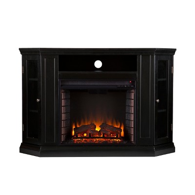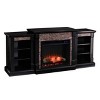 Sold as a set of multiple boxes. Set your heart aflame with this lodge-inspired, electric fireplace. Bookcase storage shelves media, novels, or trinkets. Satin black melds with simulated black river stone for a rustic touch on this traditional fireplace silhouette. Glowing faux fire logs add ambiance with flickering LED flames and lifelike embers, with or without heat. Low profile and wide scale, this electric fireplace with bookcases turns on chic style beneath your wall mounted TV in the living room or as a sleek buffet in the dining room.