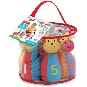 From a school book seller in 1836 to a brand leader of quality developmental and creative products for children in 2009, Galt maintains a brand heritage in the U.K. as illustrious as Elmer's in the U.S. Galt toys are designed to meet each stage of a child's development by encouraging learning through play. The award winning Soft Play range continues to expand, bolstered by the success of the innovative Playnest and Playnest & Gym. And the construction range of products features some classic favorites and some new, soon to be favorites. Galt products are rigorously tested against toy safety regulations and are quality controlled to meet the highest standard. Distributed in over 50 countries Galt is an excellent addition to Elmer's robust specialty toy offering. Jungle pals skittles , for ages 12 months and above, is a fun bowling game for young children. The skittles each contain a rattle an the ball has a jingle bell. Soft, safe and machine washable. Packed in a reusable bag with handle.