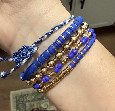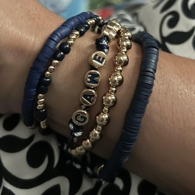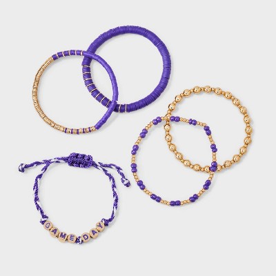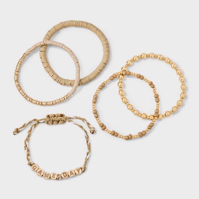5-Piece bracelet set from Wild Fable™ includes beaded, "Game Day" text, and other bracelets. Made of gold-tone metal and plastic for everyday wear. Stretch band and slide closures offer a nice fit. Great for yourself or as a gift for a sports fan.