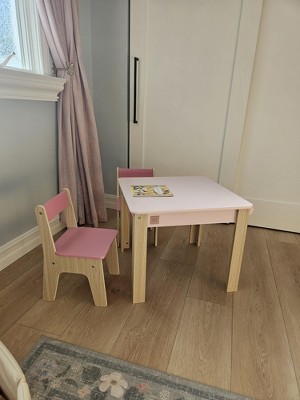 Overall, really happy with purchase. Furniture seems well built and stable. Was very easy to assemble. Love the two-tone pinks and wood tones. Probably won't use the bar for paper rolls until my toddler learns to not take it off. Perfect size and gift for my 20 month old. There is a large logo on the side of the table, which was unexpected, but it doesn't bother me. My toddler immediately colored the top with crayon and it washed off with a Clorox wipe and elbow grease. If it gets really banged up in the future, I plan on repainting it, which is why I went with wood instead of a plastic set.