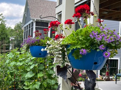 I finally found a hanging basket that looks beautiful and holds enough water so we can eliminate watering 2x day in the heat. The airflow in the pots allows the root system to develop and keep the plant healthy.