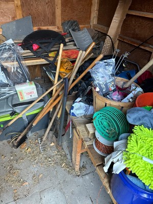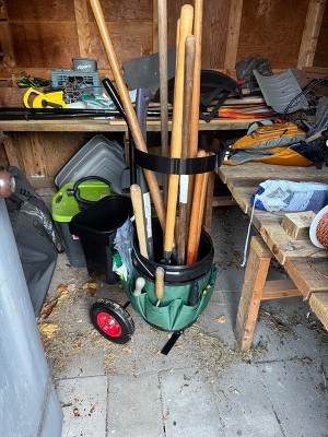 I have cut PVC pipe the size of the tool handles to keep organized & pool noodles between the PVC & over the heads of rakes, hoes, etc so I do not become injured when the tools shift during transporting from one garden bed to another...