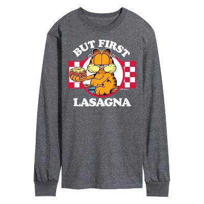 Garfield - But First, Lasagna - Men's Short Sleeve Graphic T-Shirt - Bring the humor and laziness of the famous orange cat to your wardrobe with Garfield graphic apparel. Featuring Garfield, Odie, and Jon, these designs celebrate the iconic comic strip and its beloved characters.