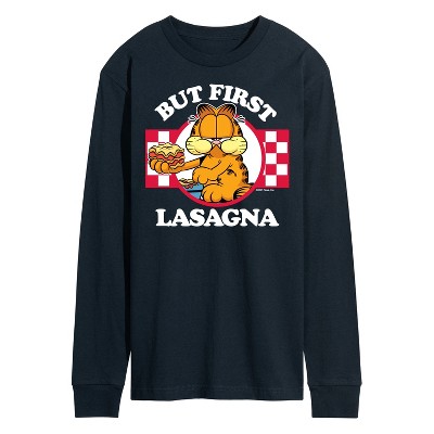 Garfield - But First, Lasagna - Men's Short Sleeve Graphic T-Shirt - Bring the humor and laziness of the famous orange cat to your wardrobe with Garfield graphic apparel. Featuring Garfield, Odie, and Jon, these designs celebrate the iconic comic strip and its beloved characters.