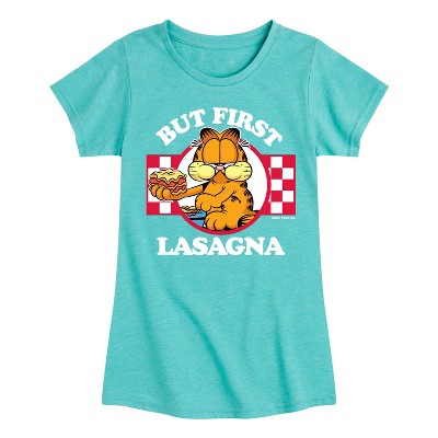 Garfield - But First, Lasagna - Men's Short Sleeve Graphic T-Shirt - Bring the humor and laziness of the famous orange cat to your wardrobe with Garfield graphic apparel. Featuring Garfield, Odie, and Jon, these designs celebrate the iconic comic strip and its beloved characters.