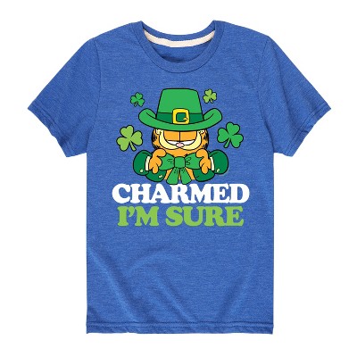 Garfield - Charmed I'm Sure St. Patrick's Day - Men's Short Sleeve Graphic T-Shirt - Bring the humor and laziness of the famous orange cat to your wardrobe with Garfield graphic apparel. Featuring Garfield, Odie, and Jon, these designs celebrate the iconic comic strip and its beloved characters.