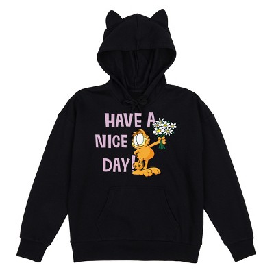 Relax in style with this adult black Garfield crew neck long sleeve sweatshirt. Featuring Garfield in a blissful moment, resting his head on a pillow while savoring a delicious stack of pancakes, this sweatshirt brings a touch of humor and comfort to your wardrobe. Made from a cozy mix of 50% cotton and 50% polyester, it's perfect for lounging or casual outings. For effortless care, machine wash it on cold with like colors and tumble dry on low heat.