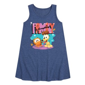 Garfield - Family Is Everything - Toddler & Youth Girls A-line Dress - Bring the humor and laziness of the famous orange cat to your wardrobe with Garfield graphic apparel. Featuring Garfield, Odie, and Jon, these designs celebrate the iconic comic strip and its beloved characters.