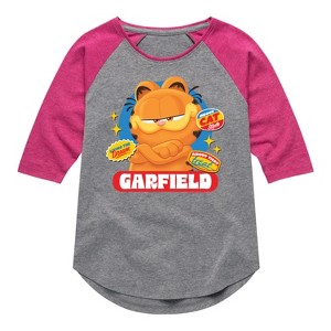 Garfield - Garfield Stickers - Toddler & Youth Girls Raglan Graphic T-Shirt - Bring the humor and laziness of the famous orange cat to your wardrobe with Garfield graphic apparel. Featuring Garfield, Odie, and Jon, these designs celebrate the iconic comic strip and its beloved characters.