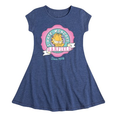 Garfield - I Hate Mondays Badge - Toddler and Youth Girls A-line Dress - Bring the humor and laziness of the famous orange cat to your wardrobe with Garfield graphic apparel. Featuring Garfield, Odie, and Jon, these designs celebrate the iconic comic strip and its beloved characters.