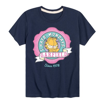 Garfield - I Hate Mondays Badge - Toddler And Youth Long Sleeve Graphic T-Shirt - Bring the humor and laziness of the famous orange cat to your wardrobe with Garfield graphic apparel. Featuring Garfield, Odie, and Jon, these designs celebrate the iconic comic strip and its beloved characters.